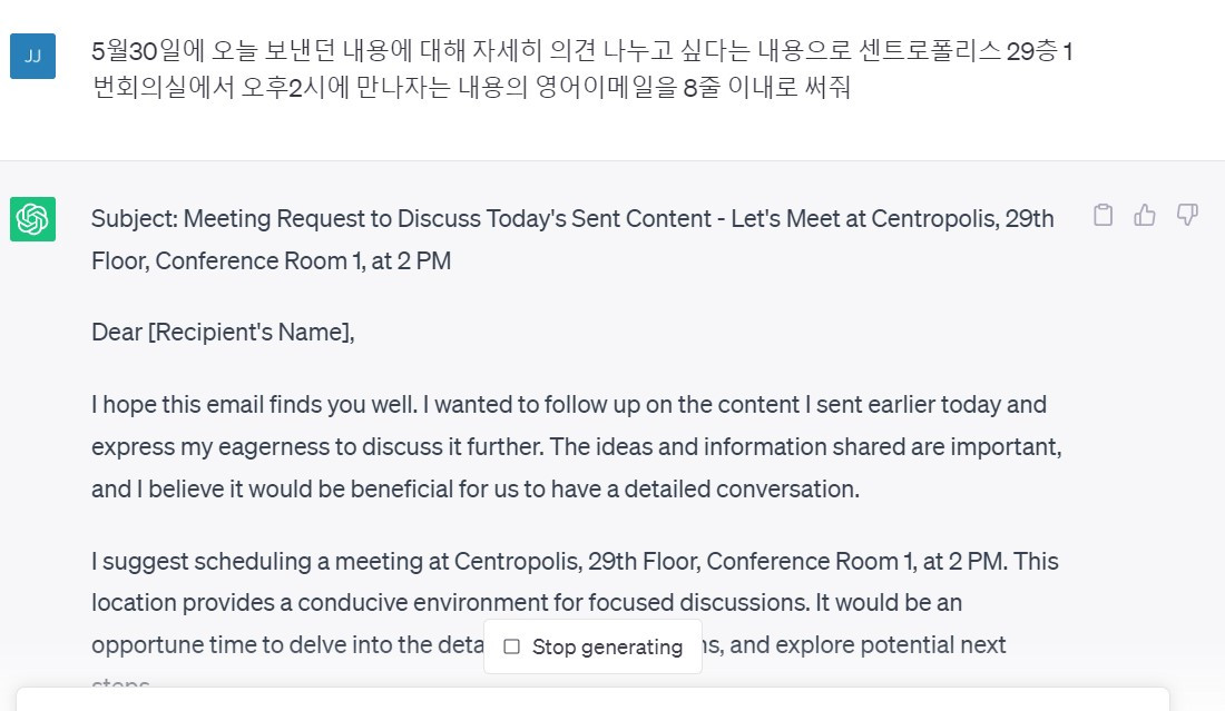 간단한 이메일 작성에서부터 감사장 초안, 그리고 각국의 언어로 보낼 수 있게 정리되는 내용의 레터준비까지!! 나에게도 비서가 있었다면~의 바람을 실제로 실현해 준 AI 인 것이다.