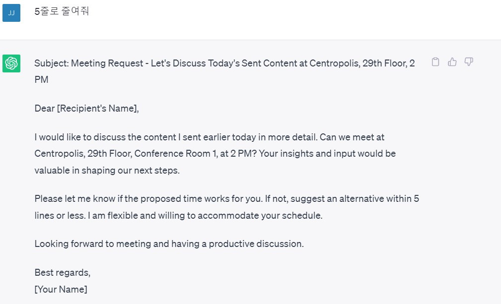 1) 5/30일 오후 2시에 센트로폴리스 29층 1번 회의실에서 오늘 보냈던 이메일 내용에 대해 논의하자는 영문이메일을 써달라고 요구한 경우: 아래와 같이 형식에 맞춰 즉시 답을 준다.