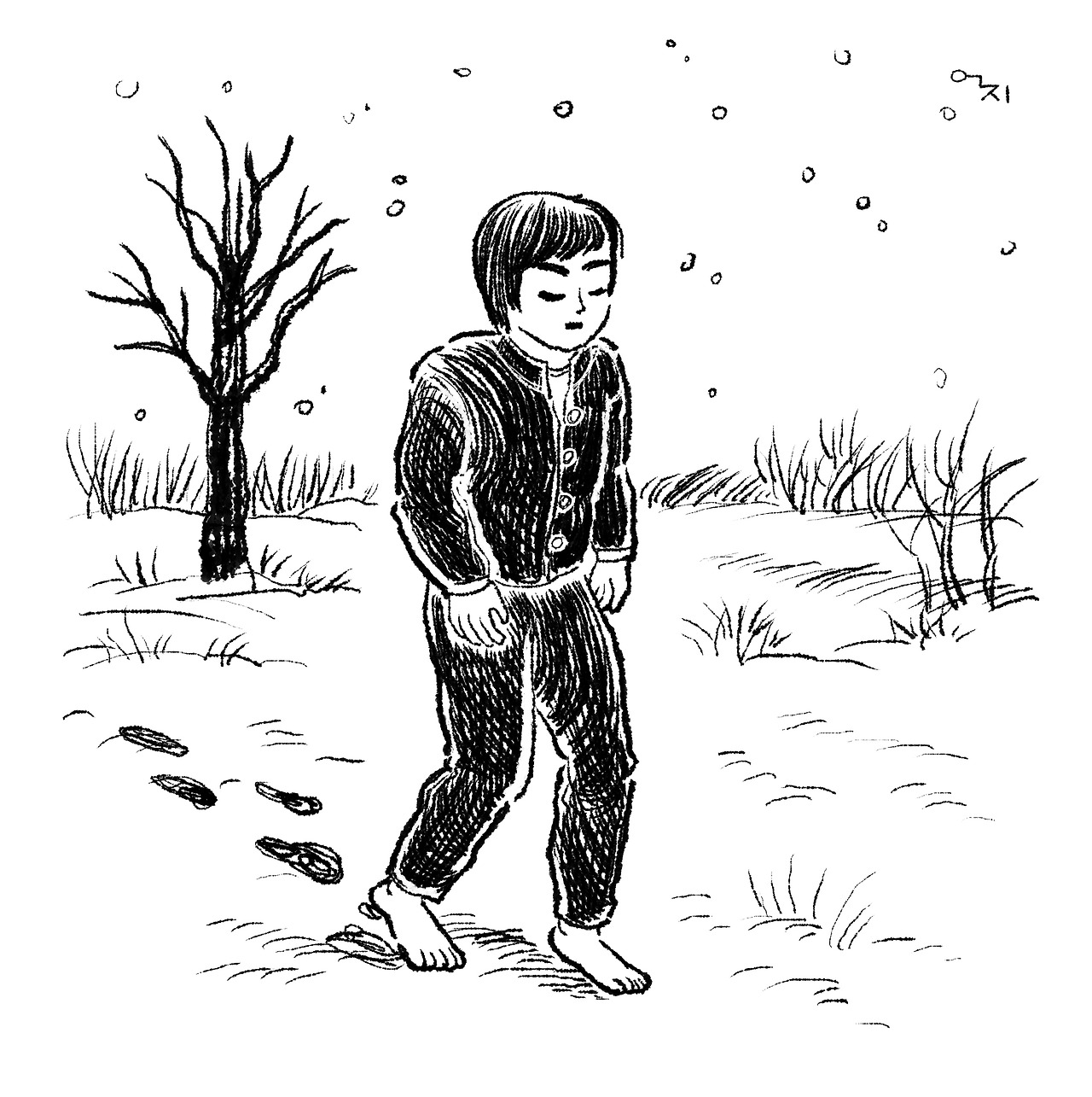 윤서는 맨발로 눈길을 걷는다. 어디에 있어도 혼자 있는 사람처럼 느껴지는 존재.