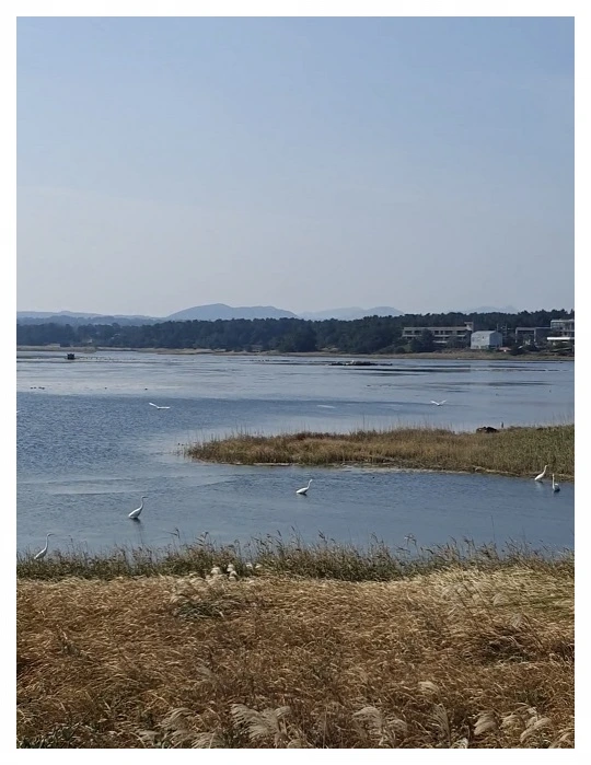 시야에 갈매기도 짙은 녹색의 해안가로 떠내려온 물미역이 보인다. 종달리 해변에서는 두루미 무리가 큰 군집을 이루고 제방으로 잔잔해진 드넓은 해안가에서 물질을 하고 있다. 목을 찍어 내리며 먹이를 찾는 녀석들과 날개를 터는 녀석, 이곳에서 저곳으로 옮겨 다니는 녀석, 사뿐사뿐 산책하듯 하거나 마치 차 한잔씩 테이블 위에 놓고 수다 떠는 사람들처럼 대화하는 모습의 두루미들까지 다양한 광경이 한눈에 들어온다.