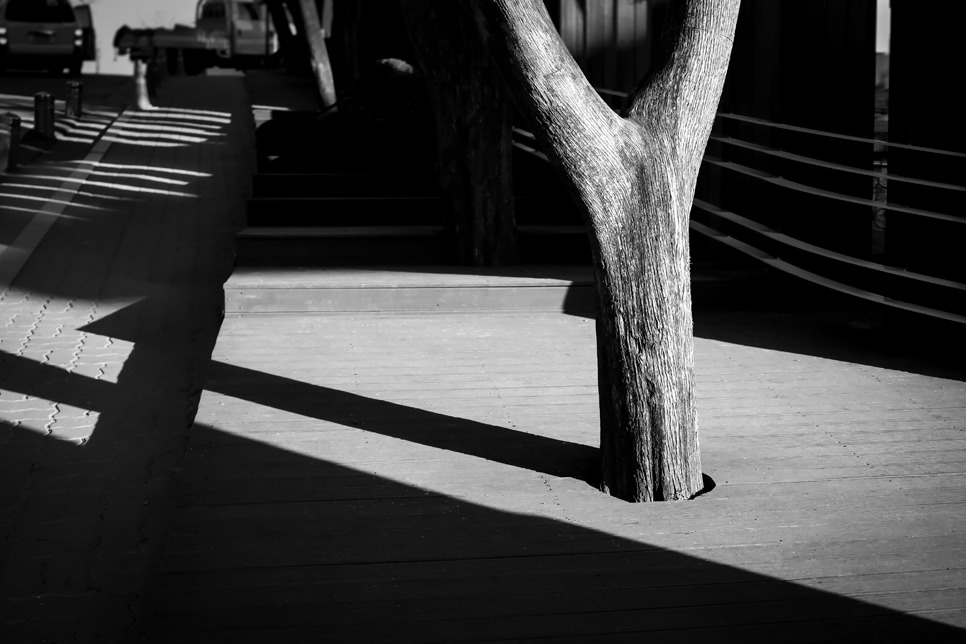 나는 길거리에 나갈 때는 40mm 내외의 단렌즈를 끼우고 간다. 거리사진의 핵심은 아무래도 ‘속도’라고 봐야 한다. 원하는 게 눈에 보이면 바로 셔터를 눌러 사진을 찍을 수 있어야 한다. 카메라를 들고 거리에 나서면 풍경은 영화처럼 눈앞을 스쳐가고, 한 번 지나간 필름이 다시 재생되는 일은 없다. 상황은 매 순간 변하고, 움직이는 세상을 향해 샷을 날리는 식이다 보니, 눈이 빠르고 손도 빨라야 한다. 찬찬히 구도를 잡고 느긋하게 피사체를 향해서 초점 맞출 여유가 없는 경우가 많은 것이다. 심지어 안 보고도 찍을 수 있어야 하고, 다음 장면을 미리 예측해서 셔터를 누를 줄도 알아야 한다. 하지만 그럼에도 불구하고, 사진 결과물의 성패는 역시 ‘구성’에 의해 좌우될 수밖에 없다. 그러니까 빛과 그림자와 건물과 사람의 움직임 등이 사진 프레임 안에서 미적 구성을 이루는 타이밍을 잡는 게 핵심이다.