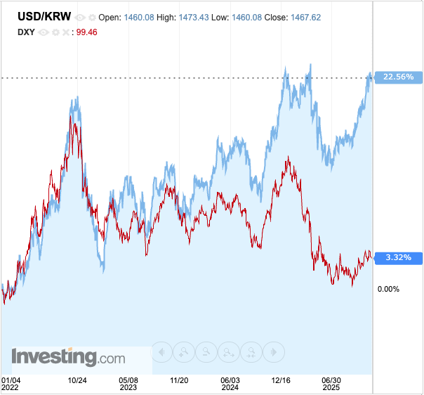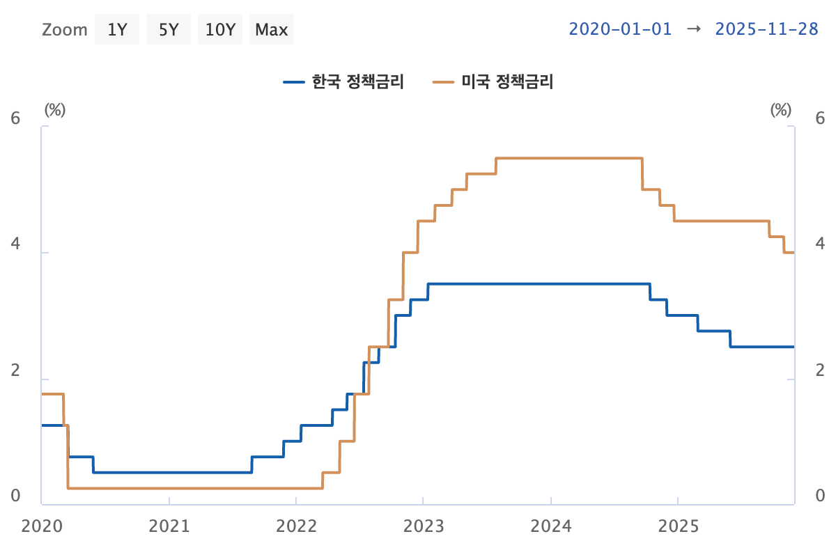 이번주(11월 27일) 한국은행은 기준금리 동결(2.5%)을 발표하면서, 환율과 관련하여 내국인(국민연금 포함)의 해외주식투자로 인한 쏠림현상에 대한 우려를 제기하였다. 즉 환헤지하지 않은 국내자본의 유출이 이번 환율 상승에 기여한 바가 있다는 분석이다.