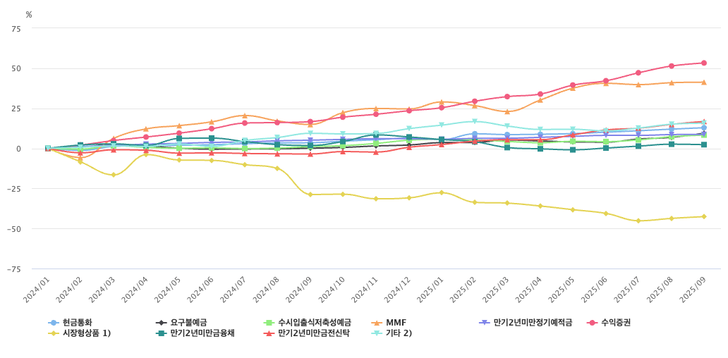 그렇다면 최근 M2는 왜 증가했을까? 한국은행은 지난 기자간담회에서 "새로 풀린 유동성은 크지 않고, 과거에 풀린 유동성이 M2로 오는 구성변화가 있다"고 설명한다. 또한 우리나라 M2는 수익증권 등을 포함하여, IMF의 기준보다 더 넓게 M2를 정의한다. 실제로 최근 M2의 증가는 현금통화나 예금보다도 이 같은 수익증권의 증가와 관련이 깊다.