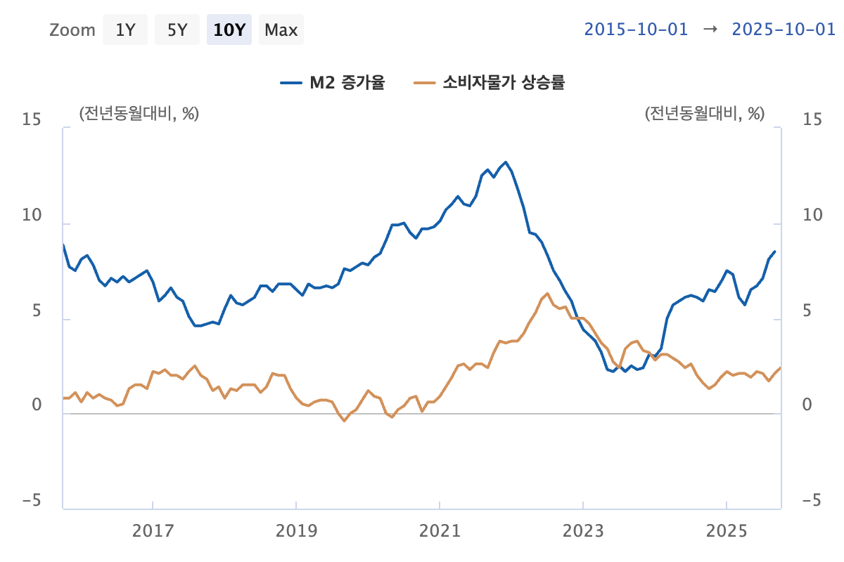 이 주장은 두 가지 사실(통화량 증가 및 원화값 하락)과 한 가지 가정(통화 가치 하락) 바탕으로 한다. 실제 데이터를 보면, 이 가정은 받아드리기 어렵다. M2의 증가률에 비해 물가상승률은 안정적이기 때문이다. 즉 통화량 증가에도 불구하고, 통화가치는 하락하지 않은 것이다.