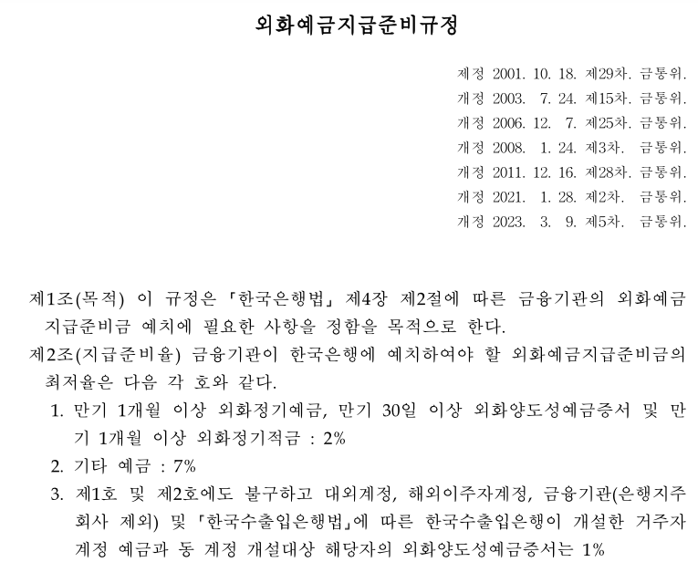 은행들이 한은에 예치하는 지준에는 원화지준말고도 외화지준이 있다. <외화예금지급준비규정>에 따라, 은행의 단기 외화부채에 해당하는 외화예금의 1~7%에 해당한다.