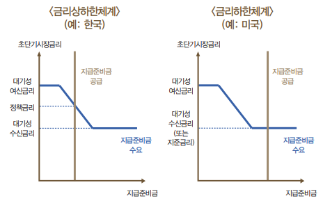 한은은 금리하한체계(floor system)을 채택하는 연준과는 달리 지준에 대해서 이자를 지급하지 않는다. (연준은 2008년 금융위기 이후 이 체계를 택하고 지준에 이자(IORB)를 지급하기 시작했다).
