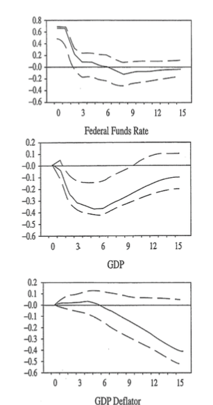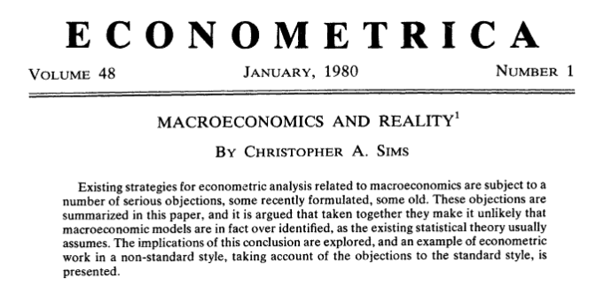 물론 데이터가 저절로 인과관계를 알려주지는 않는다. 심스가 해결해야 했던 핵심 과제는 "식별의 문제(identification problem)"였다. 수많은 충격들이 동시에 경제에 가해지는 상황에서, 오직 통화정책만의 고유한 효과를 어떻게 뽑아낼 것인가. 그는 경제 구조에 대한 최소한의 합리적 가정(structural assumption)만을 이용해 이 문제를 풀었다. 예컨대 "중앙은행은 같은 달의 GDP 데이터를 아직 모른 채 금리를 결정한다"는 식의, 경제적으로 설득력 있는 제약 조건들이다(GDP데이터는 분기별로 사후에 업데이트되므로, 통화정책이 먼저 결정되어 GDP 등 실물경기에 영향을 미친다).