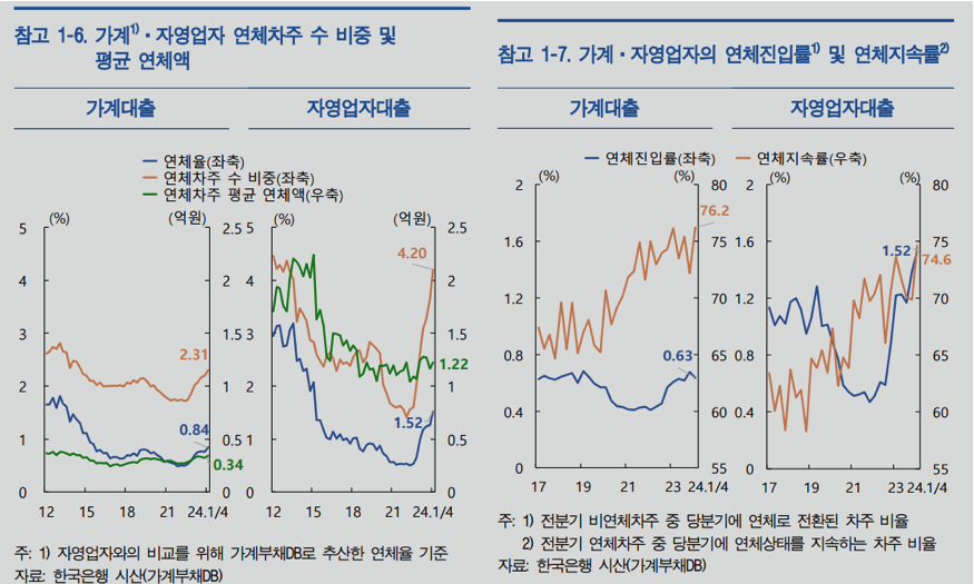 일례로 자영업자의 대출연체율이 가파르게 증가하고 있다. 지난달 발표된 한국은행 금융안정보고서에 따르면, 가계 대비 자영업자의 연체율 증가는 신규로 연체하는 차주의 비중 증가에 기인한다. 또한 이들의 연체 지속률(74.6%)이 높은 것을 알 수 있다. 즉, 최근들어 대출상환부담을 느끼는 자영업자들의 비중이 늘었고 이들의 연체는 지속될 것으로 보인다는 분석이다.