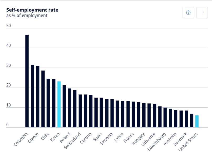 우리나라 취업자 중 자영업자의 비중은 높은 편이다. OECD 국가중 7번째로 높은 23.2%이고 미국은 6.1%에 불과하다(23년 기준). 슘페터의 창조적 파괴에서 혁신적인 기업가(entrepreneur)는 경제 발전의 주된 동인이다. 하지만 현실에서의 문제는 모든 자영업자들이 혁신적이거나 건실하지만은 않다는 데 있다.