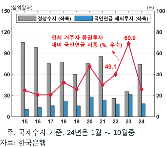 우리나라 해외증권투자 중 국민연금의 비중은 23년 기준 69%에 달했다. 국민연금은 이른바 큰 손 투자자이다. 그만큼 외환시장에 미치는 영향이 크다고 할 수 있다.