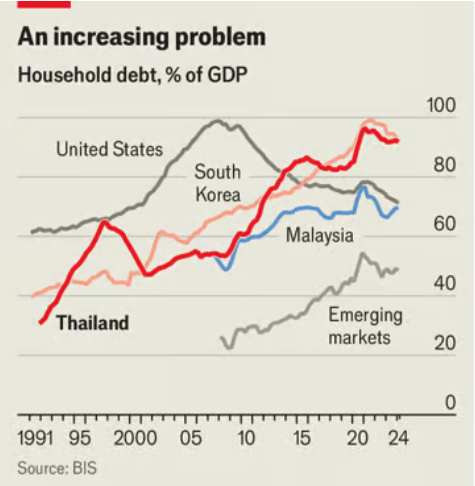 지난주에 게재된 이코노미스트지 기사는 태국 경제의 부진을 다뤘다. 주요 문제 중 하나로 높은 가계부채에 따른 소비 위축을 들었다. BIS 자료를 기준으로 태국의 가계부채는 GDP 대비 90.5%이다. 아래 그래프에서 눈에 띄는 것은 태국 바로 옆에 있는 우리나라다.