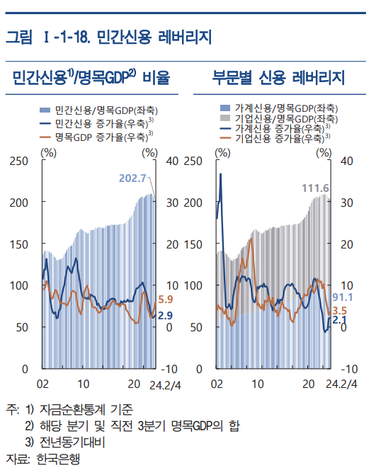 그렇다면, 우리나라는 어떤 상황일까? 크루그먼-에걸트슨 상황에 맞아떨어진다고 할 수 있다. 금융안정보고서(24년 12월)에 따르면, 민간신용(GDP대비)은 여전히 높은 편이나, 최근 가계와 기업 신용 모두 장기추세를 하회하는 디레버리징 상황에 있다.