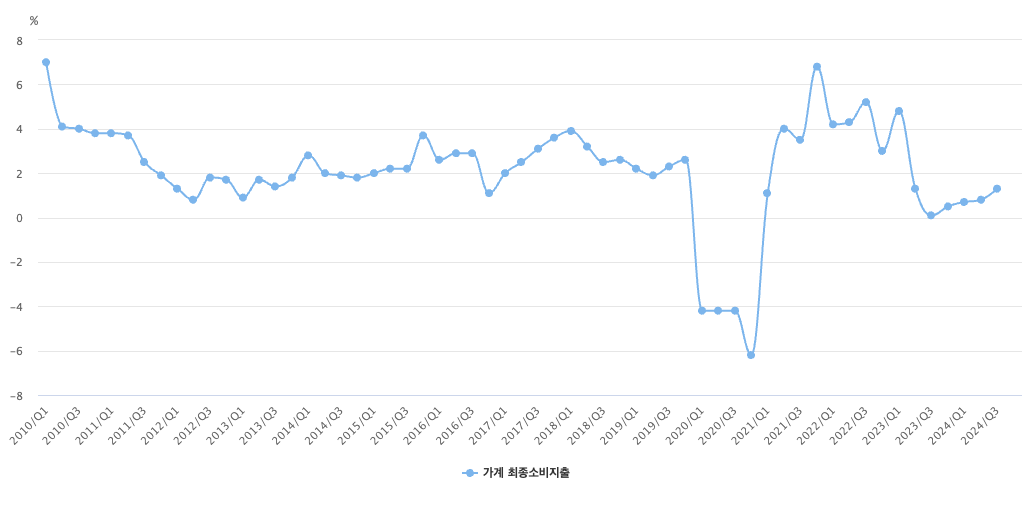 실제로 민간소비(전년대비) 증감률은 1.3%(24년 3분기)로 평균(2%, 10년1분기 이후)보다 낮은 수준에 머물러 있다. 또한 경제상황 평가(25년 1월)에 따르면, 향후 "경제심리 악화 등으로 민간소비 회복세가 약화"될 것으로 전망된다.