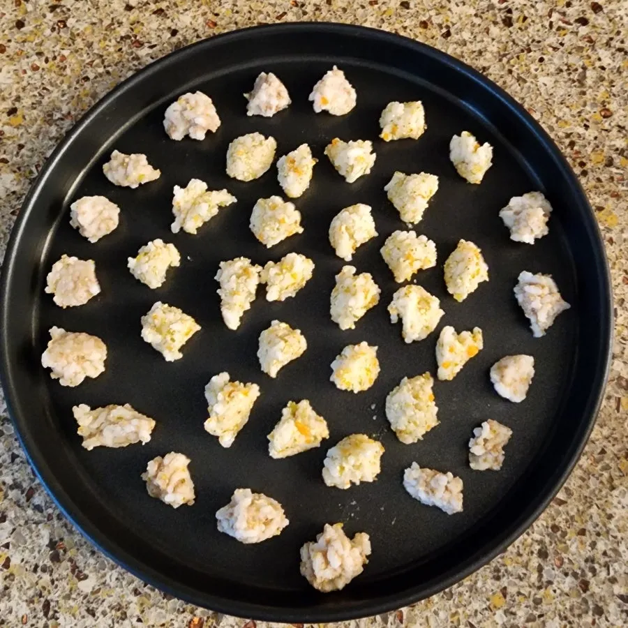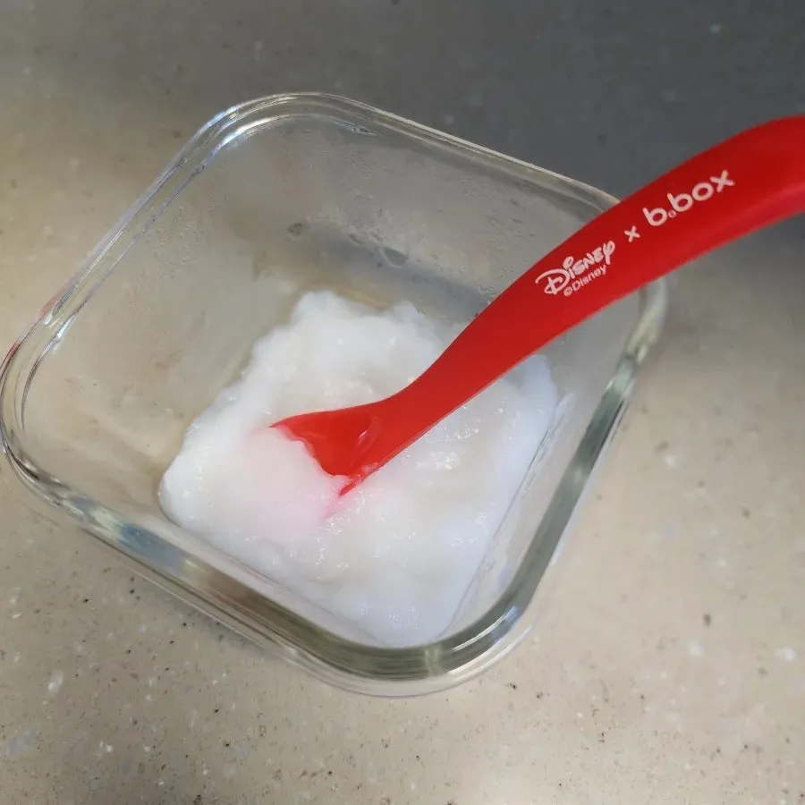 쇼핑이 답이 될 것 같지는 않아 다양한 이유식 책들과 영상을 보며 이런 저런 방법들을 궁리한 끝에, 이유식을 법랑접시에 작게 한스푼씩 떠 올리고 오븐 180도에 5분간 구워 밥볼로 만들어서 주었다. 그랬더니 아이의 손이 식사시간 내내 쉬질 않았다. 드디어 방법을 찾은 것이다!