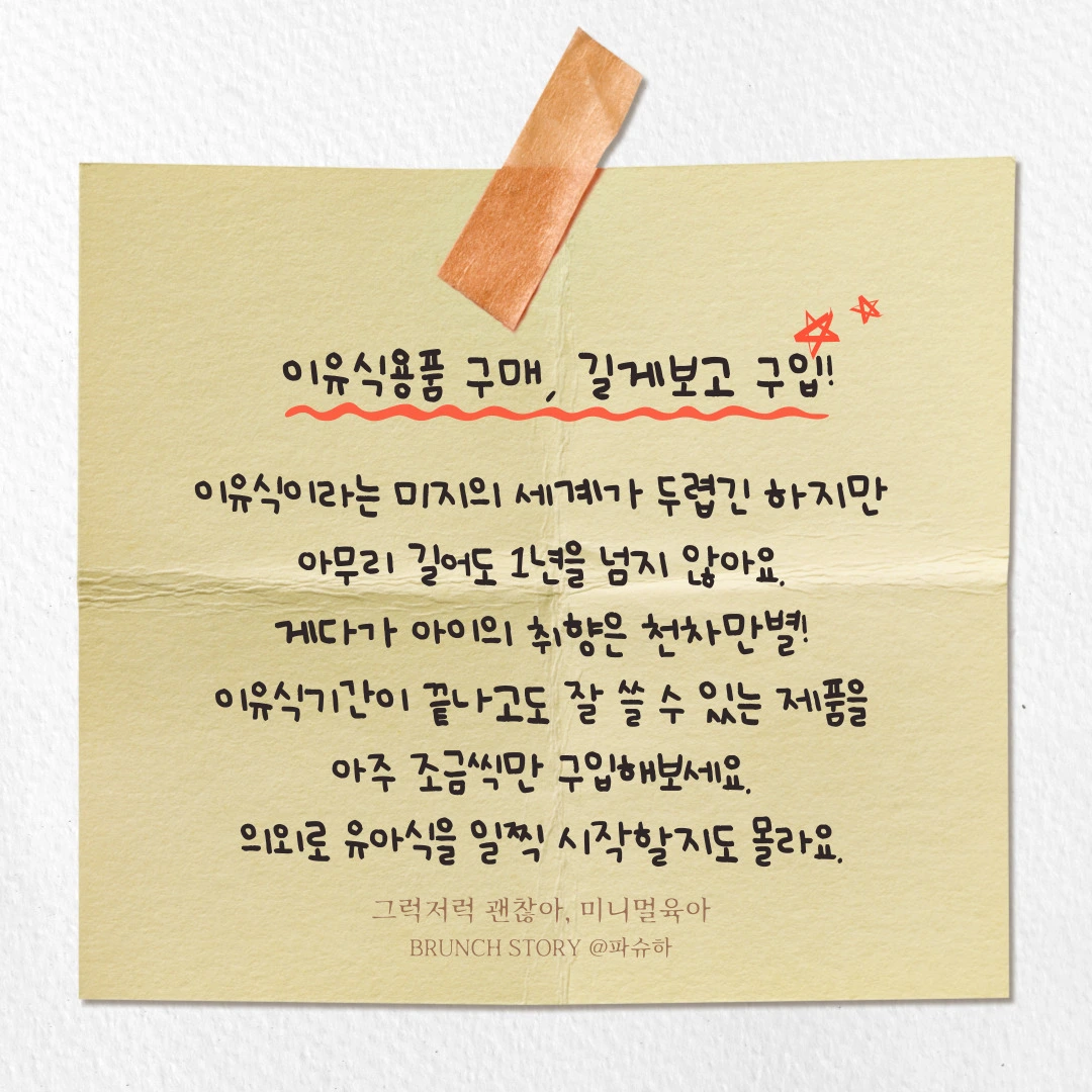 이전 이유식 글에서도 말했듯 '잘 먹어주는 아기'가 가장 중요하다. 그러나 이건 절대로 우리가 어떻게 한다고 할 수 없는 일이다. 비싸고 특출난 이유식용품은 아기의 식사를 보장해주지 않는다. 그보다는 어떻게 해야 아기가 잘 먹을지 살펴보는 부모의 관찰력이 필요하다. 이유식 용품은 이 방법, 저 방법 다 해본 뒤에 규모에 맞게 구매하면 된다.