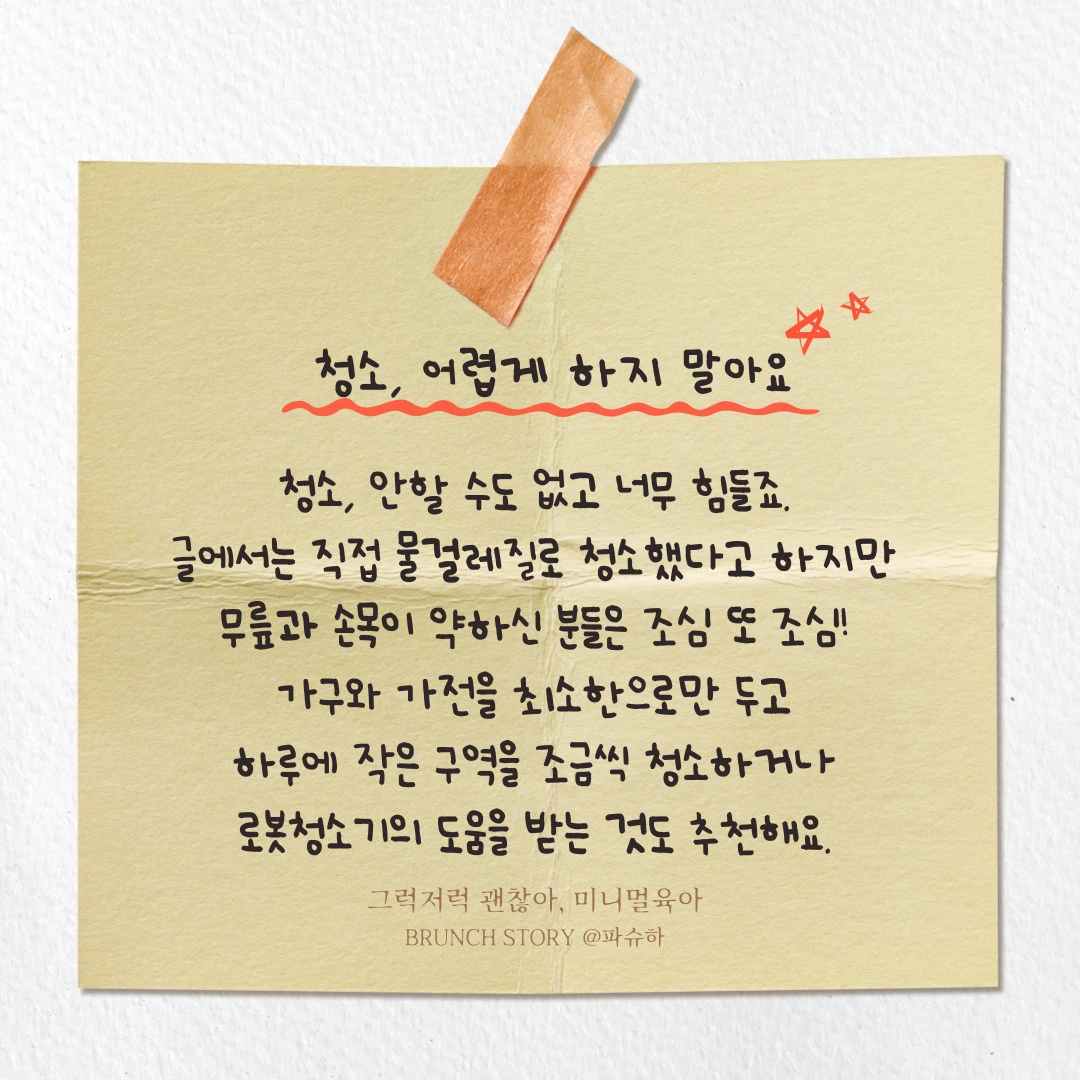 그나마 집이 작고, 무선청소기가 있었기 때문에(요즘 유행하는 100만 원 넘는 스테이션 딸린 청소기 아니고, 배터리 넣어 쓰는 스틱청소기였다. 출력 낮고 배터리 잘 망가진다며 어른들 집에서는 보통 보조 청소기 정도로 구입하는 제품이었다) 마음만 먹으면 집 청소는 금방 끝낼 수 있었다. 청소기도 간신히 돌리는데 물걸레질이 웬 말이냐.