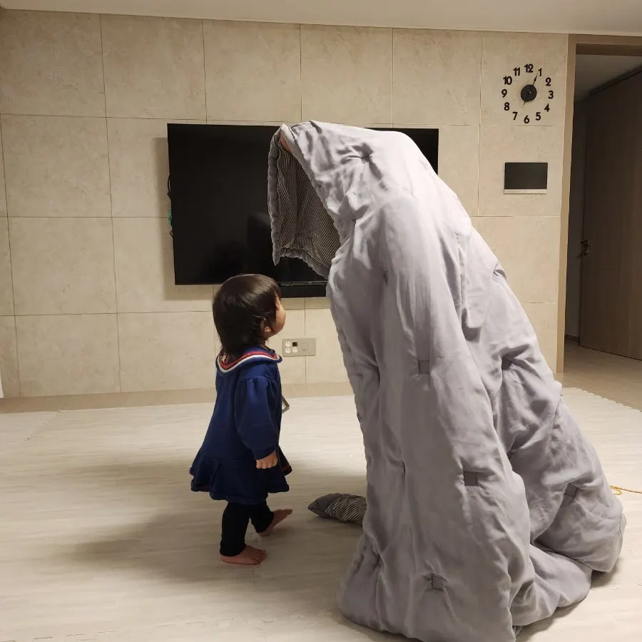 당시 세 살이었던 아이는 내가 덮으려고 사온 이불을 자기가 덮겠다며 잡아당겼고, 거실에서 놀이할 때나 잠을 잘 때나 자기 몸집보다 큰 그 이불을 끌고 다녔다. 놀 때는 이불을 거실로 끌고 나와 넓게 펴서 돗자리처럼 깔기도 했고 티브이를 볼 땐 둘둘 말아 빈백처럼 쓰기도 했다. 물건 하나를 다용도로 쓰다니 미니멀리스트의 아들로서 합격이다.