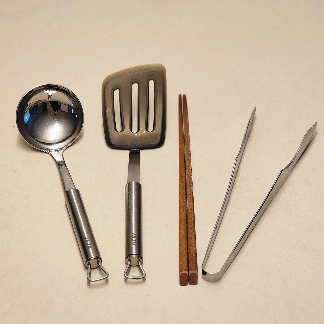 내가 가진 조리도구를 소개하자면 : 집게, 요리용 젓가락, 뒤집개, 국자가 전부다. 원래는 여기에 플라스틱 밥주걱까지 5개가 있었다. 그런데 서랍을 열 때마다 밥주걱이 자기주장을 하면서 서랍이 스윽~ 닫기는 걸 자꾸 거부하길래 화가 나서 비웠다. 마침 스텐압력밥솥을 쓰고 있던 참이라 밥숟가락으로 냄비를 긁어대도 문제 될 것은 없었다.