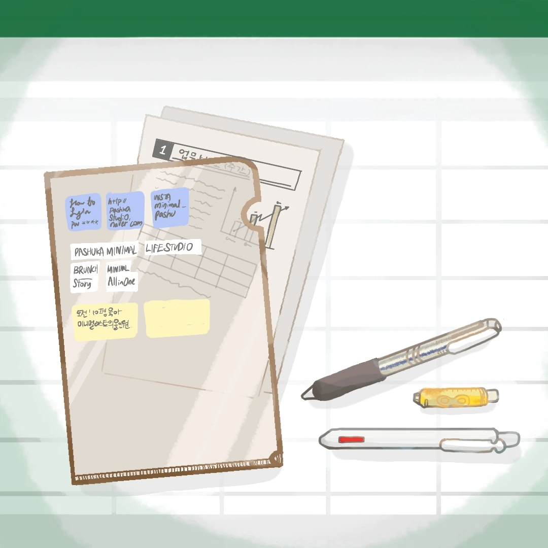 그 안에는 앞으로 당장 처리해야 할 서류들을 모아놓고, 파일의 겉면에는 업무를 할 때 필요한 정보들(예를 들면 업무용 계좌번호나 직원들이 공용으로 쓰는 사이트의 비밀번호 같은 것들)을 적어두었다. 나만의 업무 팁들도 이 파일의 겉면에 적어두었다. 완전히 체득한 팁들이나 완전히 끝난 업무 관련 메모는 뜯어내어 파기하였다.