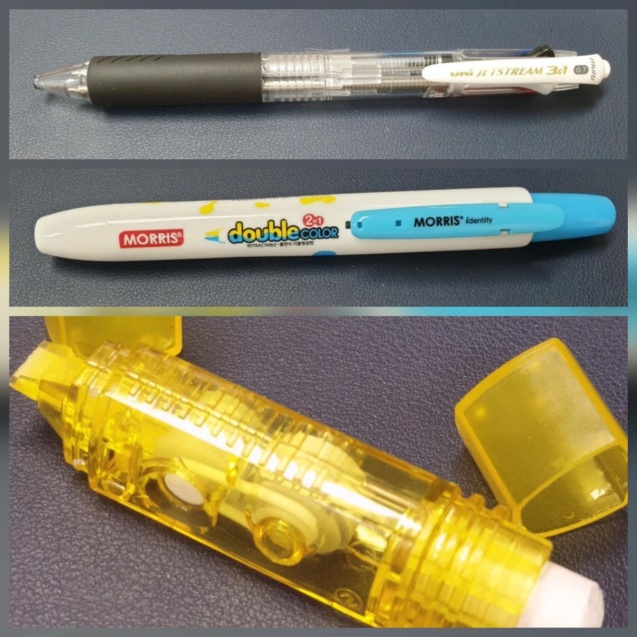 3색 볼펜과 샤프를 한 번에 쓸 수 있는 펜(제트스트림), 두 가지 색을 하나로 쓸 수 있는 형광펜(모리스), 지우개가 달린 수정테이프(다이소)를 두니 굳이 연필꽂이가 필요 없었다.