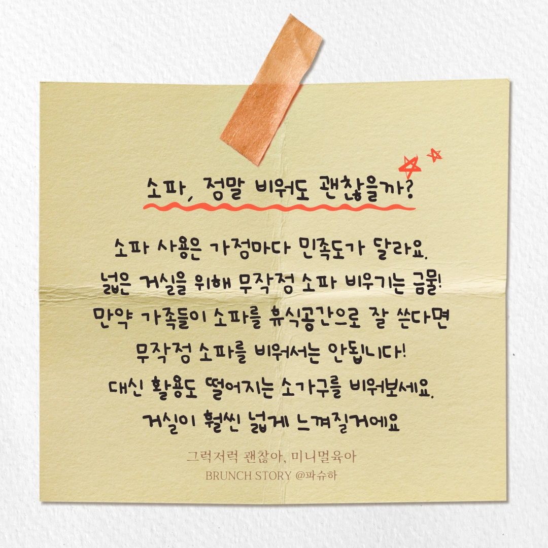 어차피 바닥에 앉아 지내는데. 소파를 치운다면 우리 아기가 기어 다닐 거실은 두 배로 넓힐 수 있었다. 돈 한 푼 들이지 않고 말이다! (물론 '한 푼'이라고 하기엔 용달비 정도는 필요했지만 거실을 두 배 넓히는 집값에 비한다면 이 정도는 수사적 표현으로 사용했음을 넓은 아량으로 헤아려 주시길 바란다)