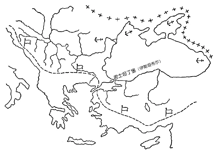 매킨더 《민주의 이상과 현실》에 나오는 심장지대 세력과 해양세력의 경계. 해양세력의 최대 경계는 위의 십자 점선, 심장지대 세력의 최대 경계는 아래 점선이다