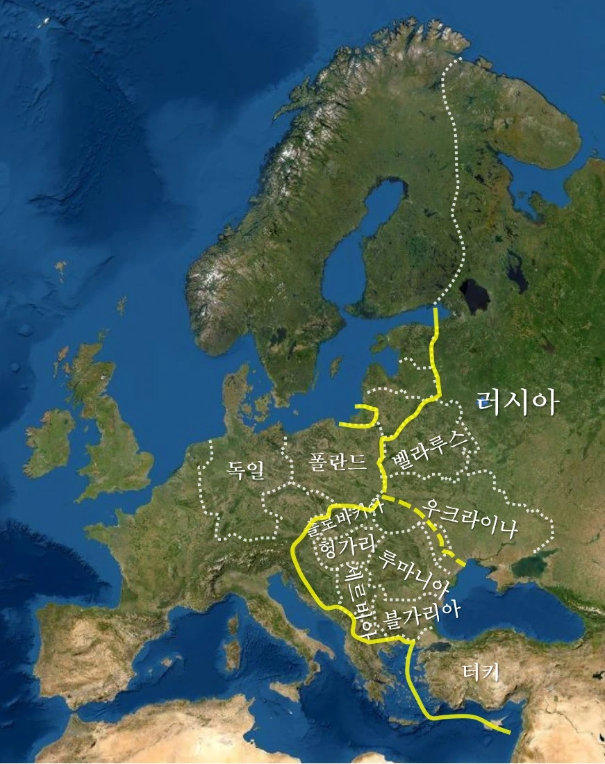 러시아의 최대 진출 가능선(노랑색 점선은 카르파티아 산맥에서 러시아군 서진을 저지할 경우)