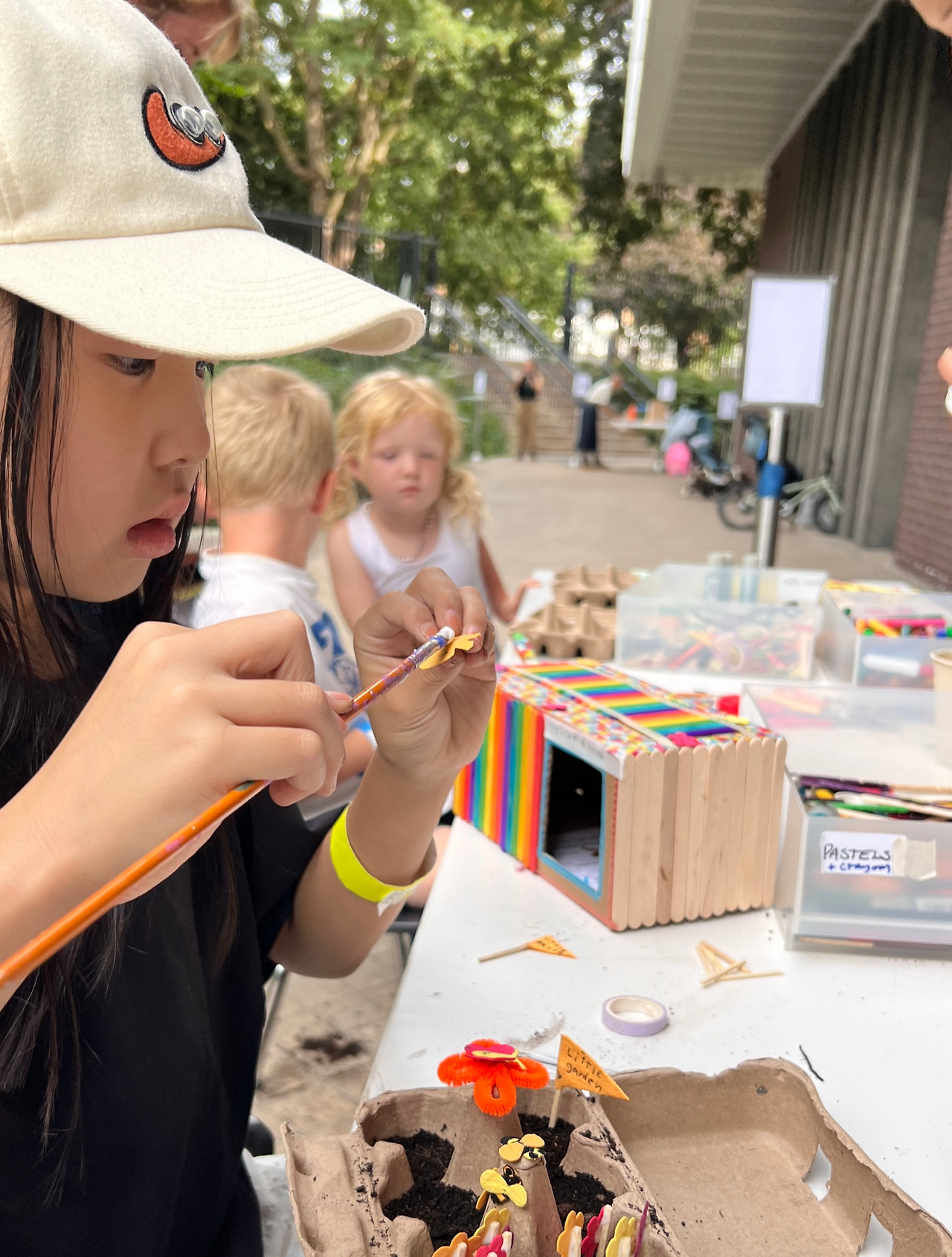 새 집을 오랜 시간 걸려 완성하고 다음 공간으로 이동해 미니 가든을 또 정성스럽게 꾸몄다. 달걀 상자를 재활용해서 만들었고, 디자인뮤지엄 정원에서 낙엽과 지렁이를 모아 영양소를 풍부하게 만든 흙을 조금씩 담아줬다. 씨를 뿌려 놓으면 이틀이면 자란다고 한다. 이렇게 35일 일정의 여행 첫날부터 만든 것을 에어비앤비까지 소중하게 싸들고 왔다. 담율이는 사람들의 찬사를 많이 받은 결과물이 너무 마음에 들었는지 한국까지 가지고 갈 거라고 했다. 나는 영국을 떠나 파리로 이동하기 전까지 다른 재미있고 예쁜 것들로 오늘 만든 것에 대해 잊게 해서 몰래 정리해 버려야 될 것 같다는 목표가 생겼다. (결론부터 말하자면, 일부 성공, 일부 실패했다. 새 집을 만들었던 재료들을 다 분리해서 한국까지 가져왔다. 이 재료들로 집에서 다시 만들 거라고 한다. 진정한 지속가능한 디자인이다.)