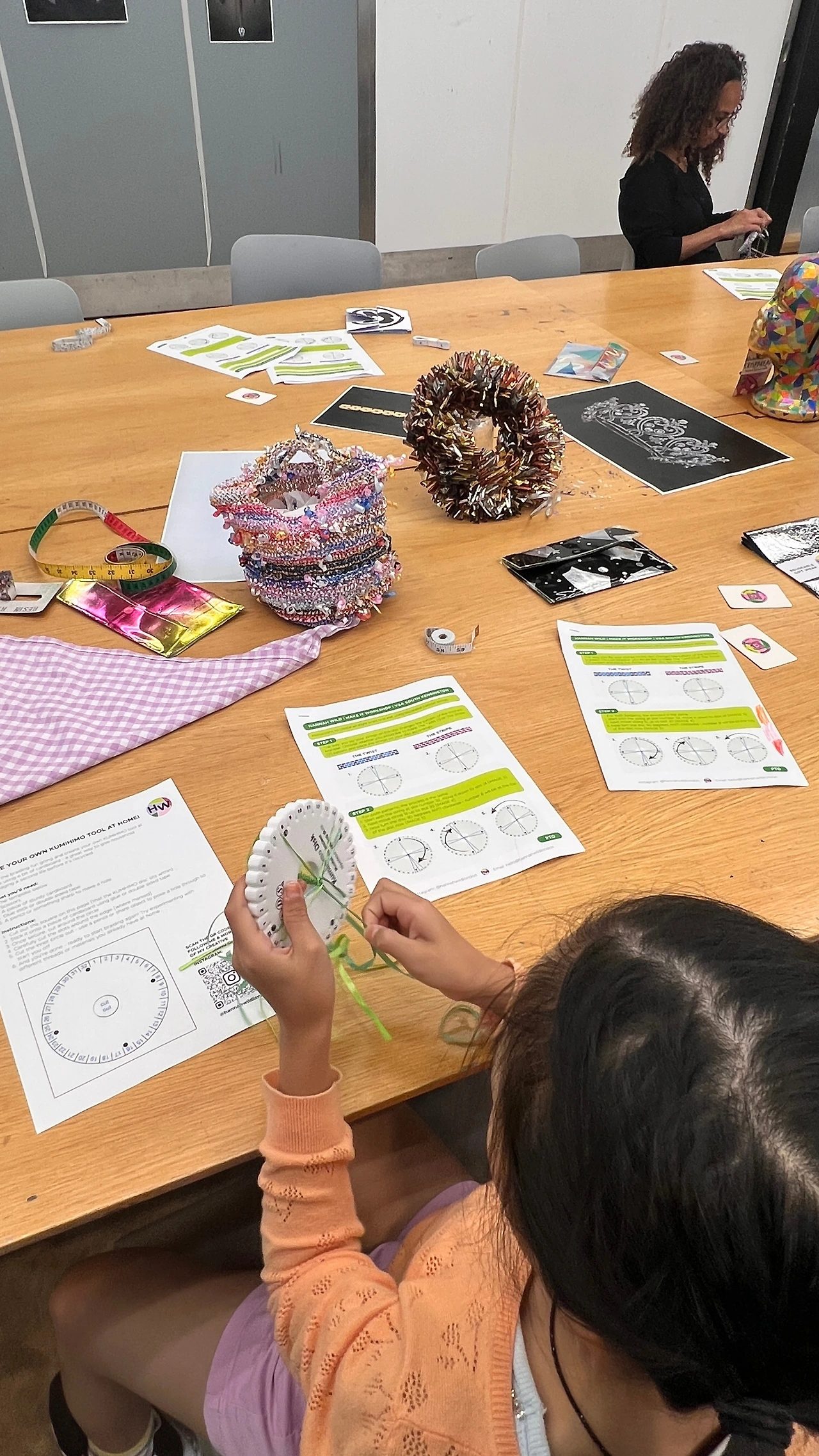 한나 선생님이 본인의 예술 작품에 대해 간략히 설명했다. 지속가능성에 대한 예술적 탐구 과정에 대한 내용이었다. 파티가 끝나고 나면 버려지는 재료들, 풍선, 풍선 리본 등을 모아 새로운 제품으로 업사이클링하고, 제품을 제작하는 방법은 전통적인 뜨개 방식과, 일본에서 매듭을 지어 만드는 방식을 사용하고 있었다.