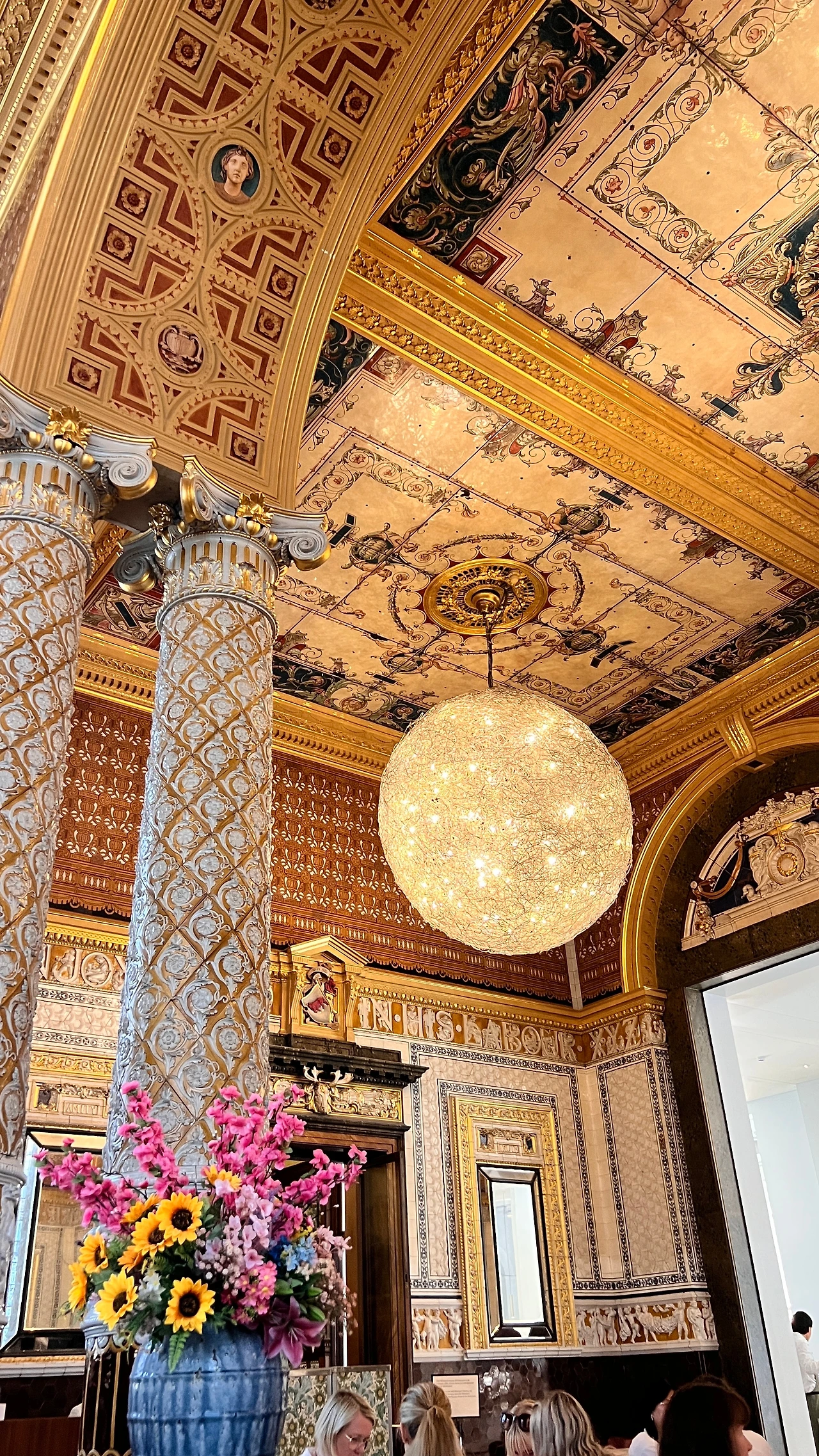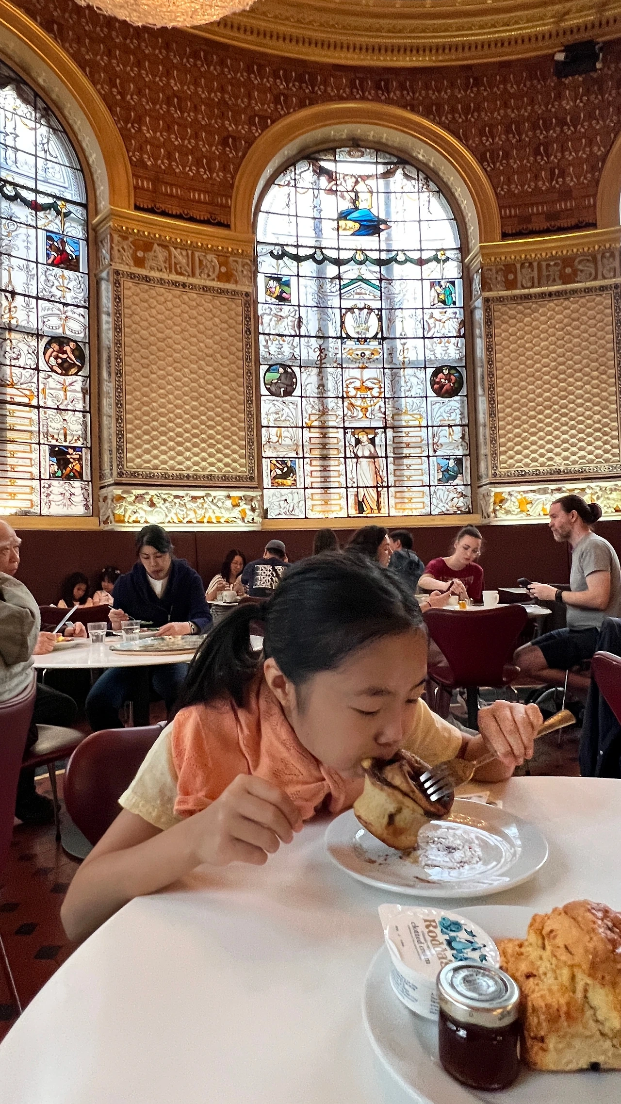 워크숍 시간이 한참 남아 아름답기로 유명하다는 V&A 내 카페로 먼저 향했다. SNS에서 근사한 사진으로 보고 기대가 아주 컸는데, 파리의 오르셰 뮤지엄 레스토랑에서 먼저 황홀한 경험을 했던 터라 첫인상은 실망감이 다소 있었다. 스콘과 시나몬 번, 그리고 차를 시켜 음미하는 동안 구석 구석 살펴보니 공간의 디테일이 엄청났다. 기둥이 채색이나 원 재료를 그대로 깍은 것이 아니라 타일로 하나하나 붙였다. 이쯤되면 패턴과 타일 장인들의 나라이다.