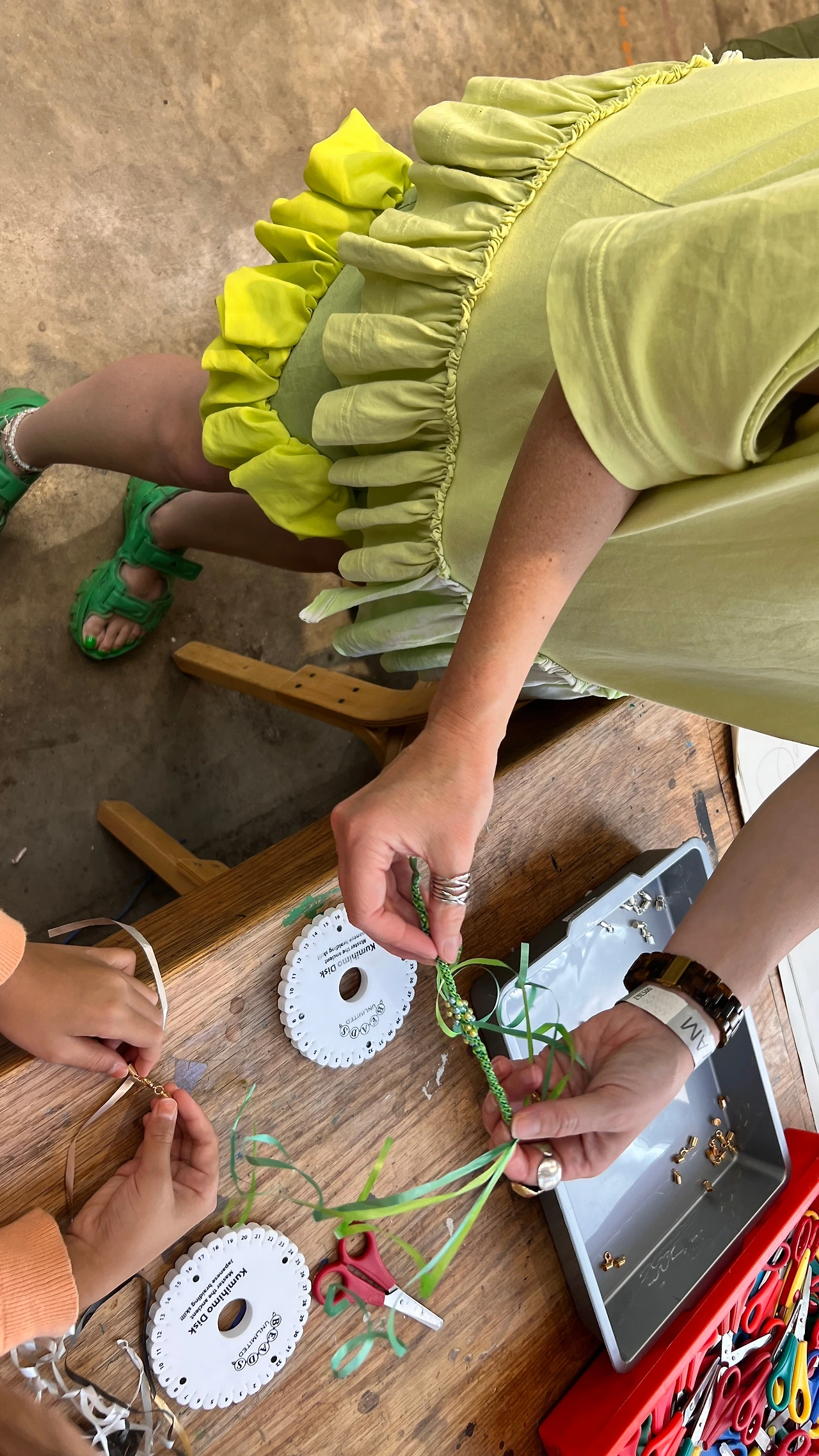 단순 반복 작업이라 어렵진 않았지만 집중하지 않으면 순서를 놓여서 다른 꼬임이 생기기도 하고, 구슬이 불규칙하게 모아졌지만, 이게 또 핸드메이드의 매력인 것 같다. 어린이들이 매듭을 꼬는 동안 선생님 몇 분이 돌아다니며 잘 꼬아지고 있는지 살펴봐주신다.
