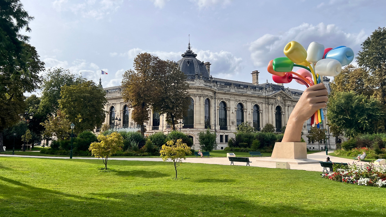 프티 팔레 건물에서 나와서 정원으로 나가 보았다. 정원의 한 가운데 제프 쿤스의 ‘튤립 꽃다발 (Bouquet of Tuilips) 조각이 있다. 손의 모공까지 모두 표현된 극사실 주의 조형물이었다. 파리 연쇄테러의 희생자들을 추모하고, 희망을 선물하려 제작되어 시민들에게 기증되었다고 한다. 프랑스가 뉴욕에 보낸 ’자유의 여신상‘을 패러디한 것이라고. 그러나, 키치적인 작품 특징과 상업주의의 행보를 보여온 제프 쿤스 작가에 대한 반감으로 한동안 파리 시민들의 엄청난 비난에 직면하기도 했었다고 한다. 담율이는 파리 혁명 시기 시민군을 이끄는 여신이 들고 있는 깃발이 생각난다고 했다. (이 그림은 루브르 박물관에서 투어 과정에 보게 된다.) 그렇다면 작가의 의도가 누군가에겐 잘 전달이 되고 있나보다.