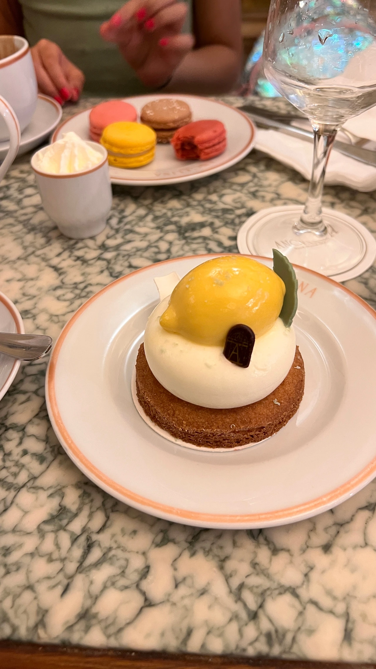 따뜻한 차, 핫초코, 마카롱, 레몬 타르트를 주문했다.