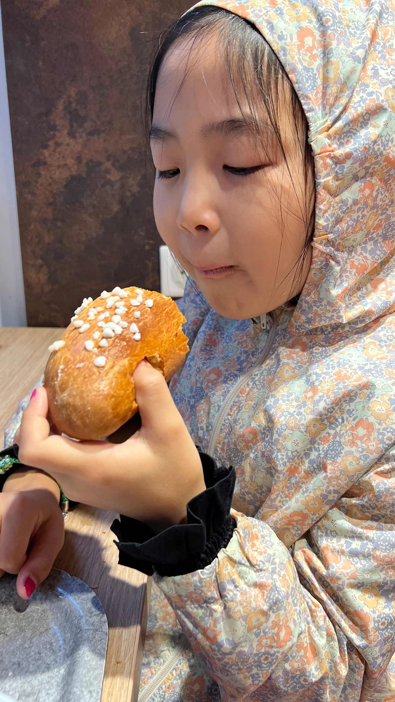 바삭해!!! 속은 정말 부드러워! 부드럽지만 쫄깃해! 너무 맛있어! 내일 또 먹자! 아직 따뜻해! 엄마는 껍질이 좋아, 속이 좋아? 나는 다 좋아!