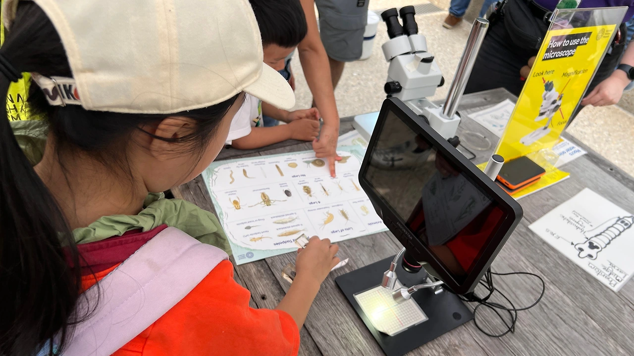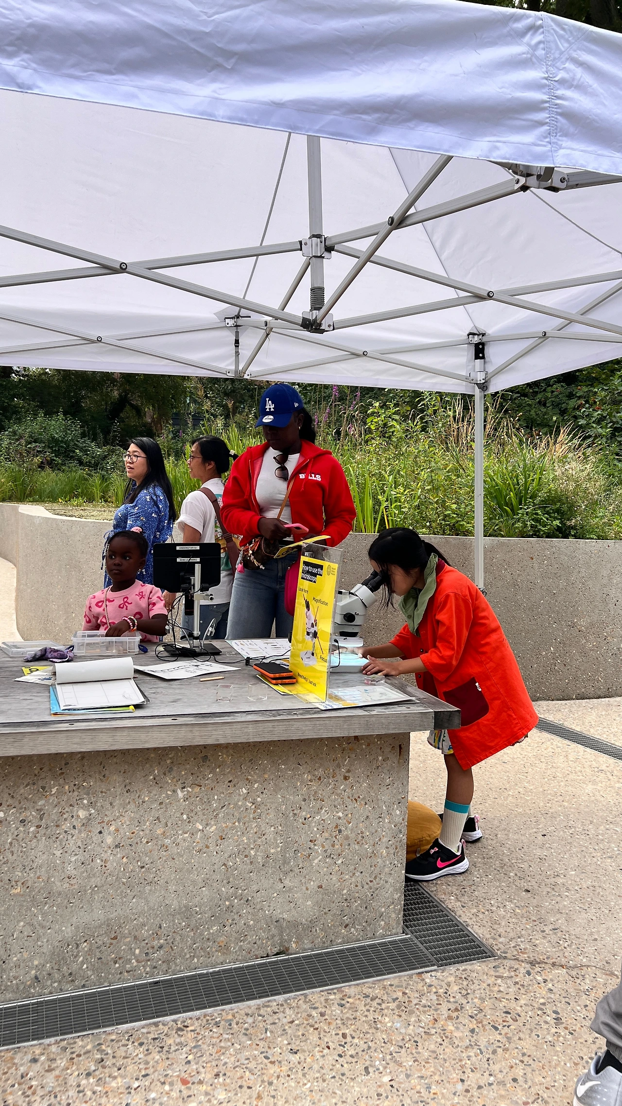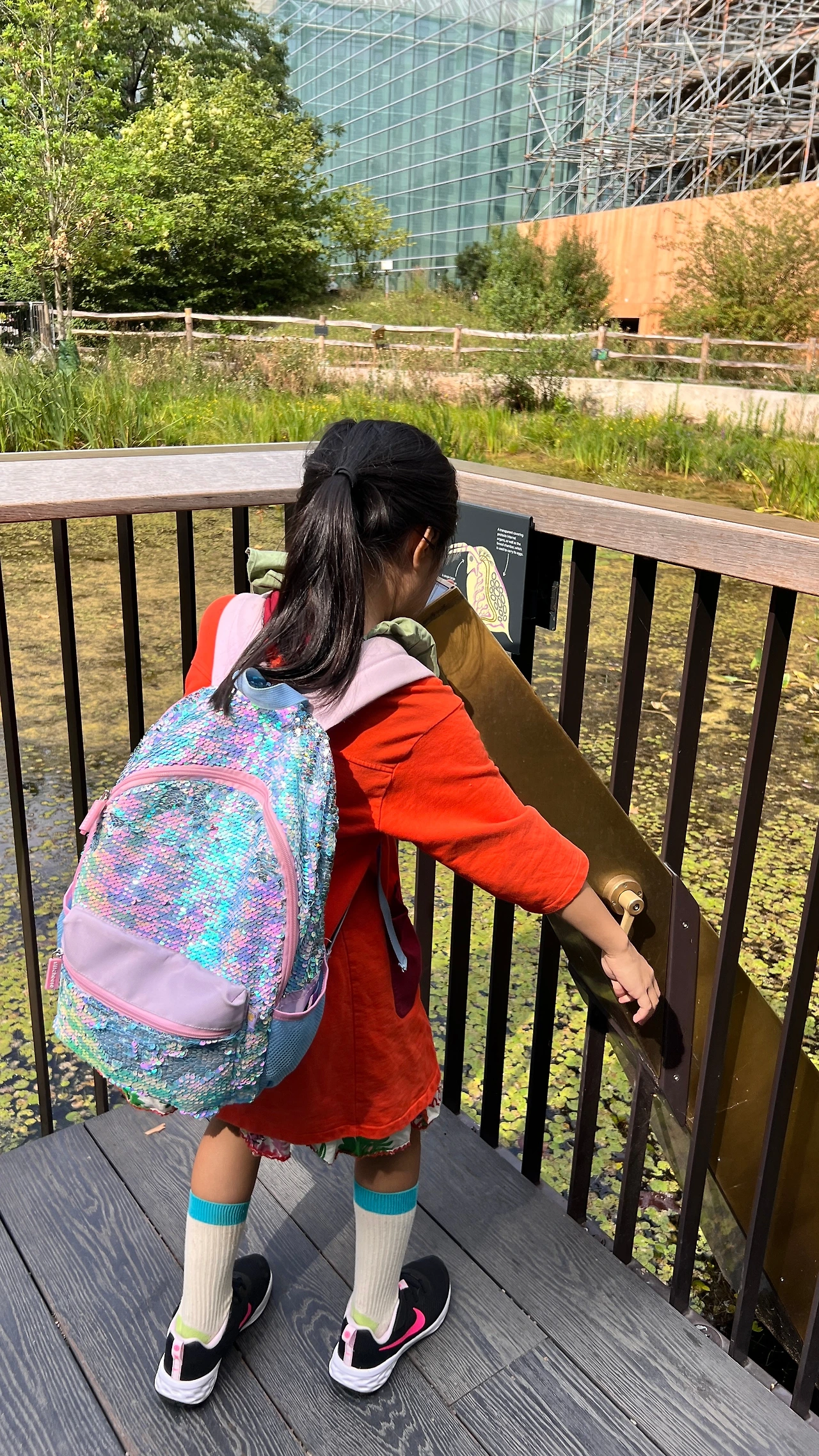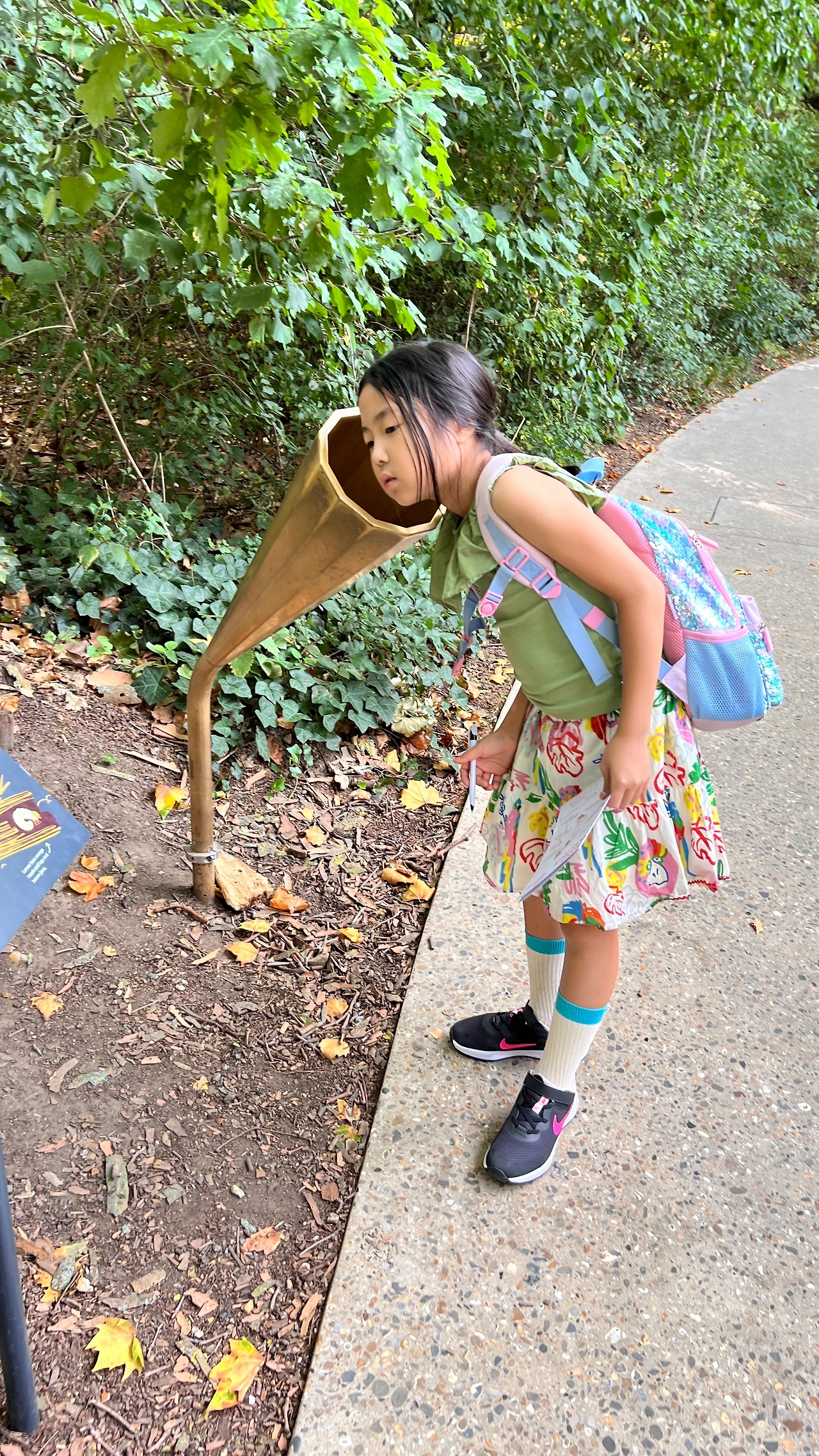 연못의 생태계를 이루는 식물과 곤충, 동물들을 관찰할 수 있도록 현미경과 돋보기 카메라를 준비해 놓고, 관찰을 도와주는 선생님들이 계셨다. 눈에 잘 보이지는 않지만 생태계를 이루고 있는 수많은 생물들을 세심하게 관찰할 수 있도록 곳곳에 설치된 요소들은 예술에 가까웠다. 묵직한 황동으로 만든 조각, 연못 속 소리를 들을 수 있는 스피커 등을 통해 생태 감수성을 즐겁게 키울 수 있는 공간이었다.