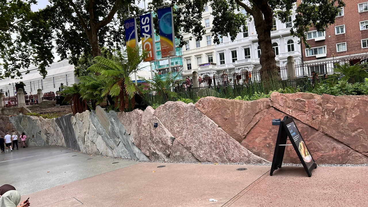 여러 컬러의 석재를 붙여 만든 벽은 시대별 대표적 암석들로 조성했는데, 지질시대에 따라 1m 길이씩 암석을 잘라 붙여 지구의 5백만 년에 해당하는 시간이 벽을 따라 흐르도록 디자인하였다.