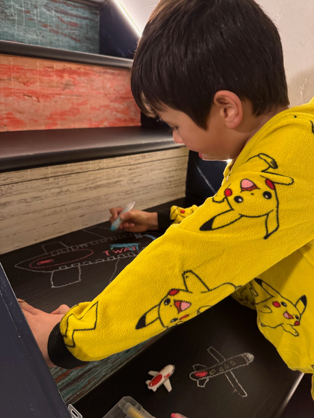 He stood there planning it all out and said, “Halmi (Grandma), I’m going to draw an airplane on the top step, the boat on the bottom, and the street with cars in the middle!”