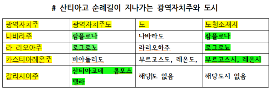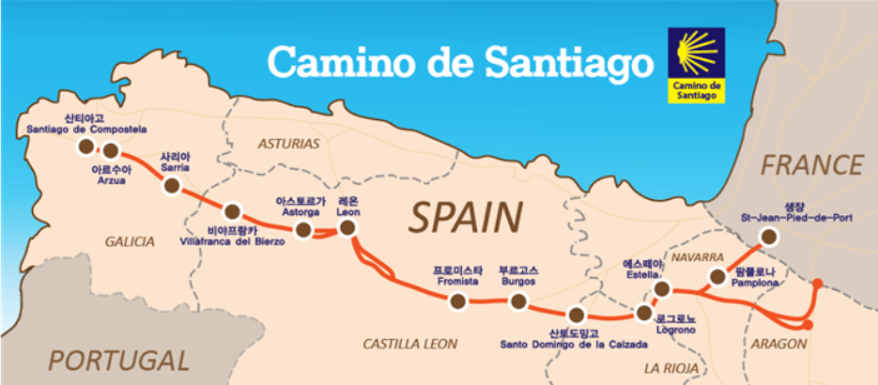 산티아고 순례길은 피레네 산맥을 넘어가면서 출발하는 첫날 스페인 영토에 집입하면서 스페인의 북부지역 중에서 나바라, 라 리오하, 카스티아 이 레온, 갈리시아의 4개의 광역 자치주를 통과하게 된다.