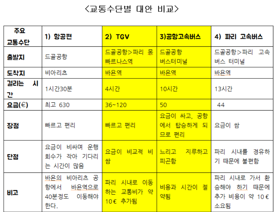 1) 드골공항에서 비행기를 환승하여 바욘에 가까운 ‘비아리츠’ 공항으로 간 후에 바욘 역으로 이동하는 방법 2) 드골공항에서 고속버스를 타고 바욘 역으로 직접 가는 방법 3) 드골공항에서 파리 시내 몽파르나스 역까지 이동하여 그곳에서 TGV를 타고 바욘 역으로 가는 방법 4) 드골공항에서 파리 시내 고속버스터미널까지 이동한 후에 고속버스를 타고 바욘으로 이동하는 방법에 대하여 각각의 장단점을 표로 만들어 보여주고 나더러 선택하라니 이렇게 친절한 비서를 무보수로 대동한 여행자가 있으면 나와 보라고 소리치고 싶었다.