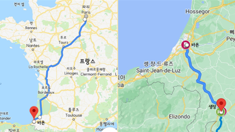 (좌) 파리에서 바욘까지 (우) 바욘에서 생장까지