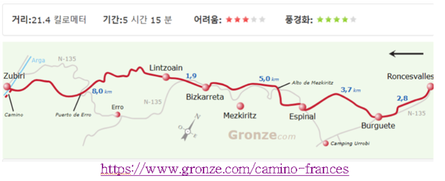 오늘(9.25)은 7시에 론세스바예스(Roncesvalles)를 출발하여 ▷ 수비리(Zubri)까지 21.4km 거리를 오르락과 내리락을 서너 번 반복하며 걸었는데 레스토랑을 발견하지 못해서 약 2km를 더 걸었기 때문에 6시간 가까이 걸었다.