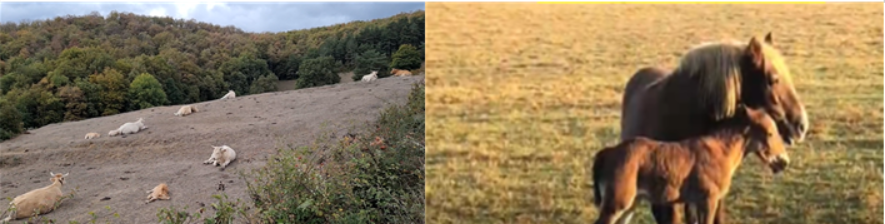 이곳에서 만난 말 무리는 우리가 늘 보아온 말의 기본 체형이 아니었다. 말들은 다리가 짧고 살이 쪄서 잘 달릴 것 같잖고 식용으로 사육하는 말들 같았다. 말 무리들은 순례자들이 건넨 말에 한마디도 대답하지 않은 채로 한가하게 풀을 뜯어먹고 있었다. 어떤 말 모자(母子)가 보인다. 에미 말이 새끼 말을 교육시키고 있는 것 같다.