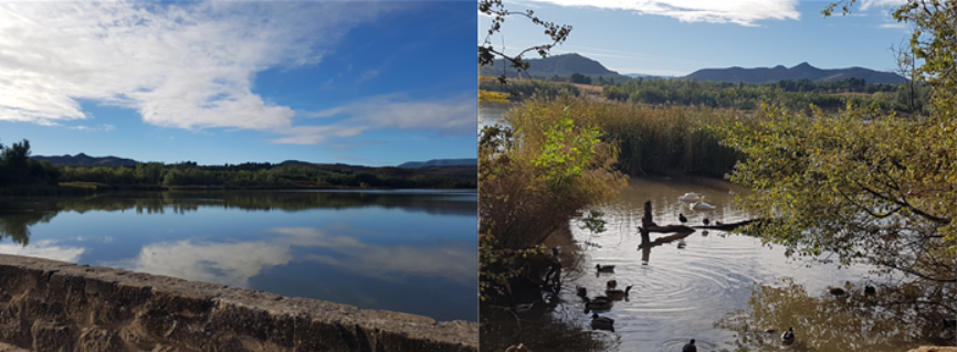 충북 제천시에 있는 ‘의림지’를 연상케 하는 저수지가 나타났다. 그 이름이 '그라헤라 호수'란다. 호수 속에 아침 해가 달처럼 떠있다. 호수의 한 구석지에 오리 열댓 마리가 물놀이를 하고 있다. 이런 정도의 호수야 우리나라도 없지 않지만 ‘라 리오하’의 포도원의 "생물 다양성 시범공원"이란 간판이 서 있어서 그 특징을 찾아보지만 내 느낌으로는 별거 아니다.