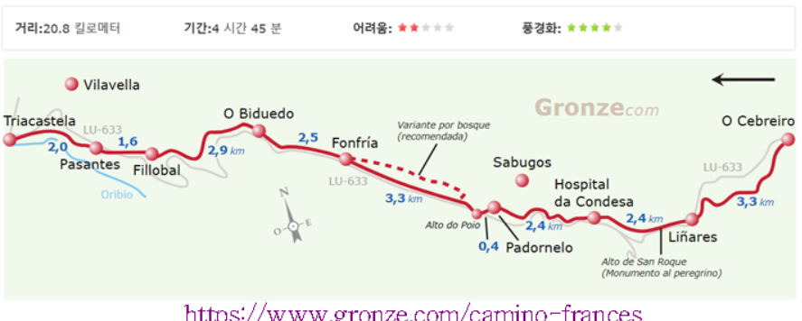 오늘(10.22) 코스는 오 세브로이로(Ocebreiro)를 출발하여 ▷ 트라야 카스텔라(Triacastela)까지 20.8km를 5시간 동안 3만 3천 보를 걸었다. 오 세브레이로 ~포요 고개를 오르는 언덕을 빼고는 힘들지 않았다.