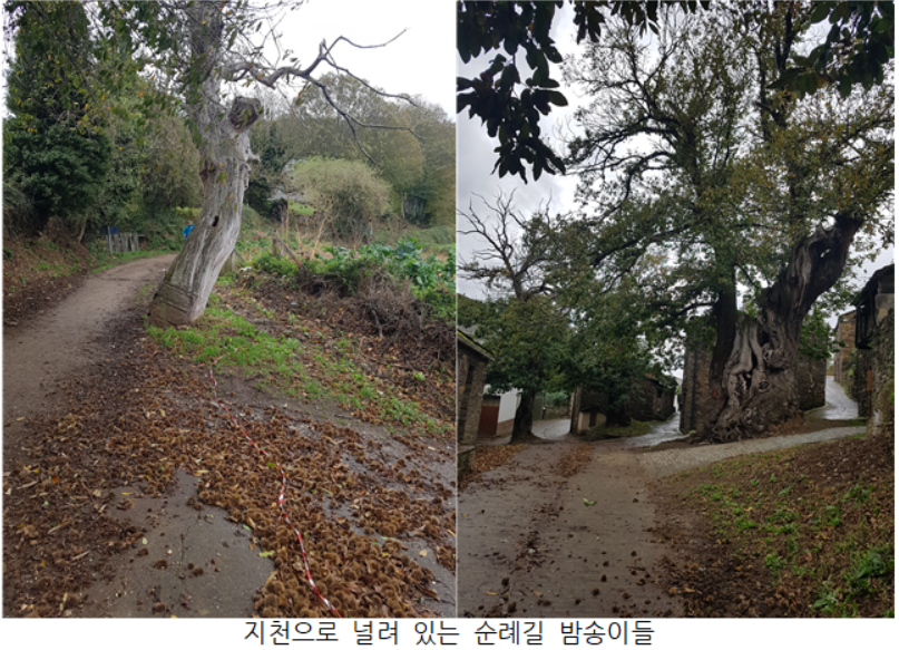 내 나이가 조금만 젊었어도 순례길에서 고사리를 뜯어다 경동시장에서 팔아먹을 생각을 할 텐데. 많은 알밤들도 주워다가 대학로나 홍대 앞에서 알밤장사를 한다면 여생에 돈 걱정을 안 해도 살 수 있을 텐데. 내 나이가 어때서? 묻는다. 피식 웃는다. 하는 소리지 무얼! 집 가까이 있는 우면산에서는 밤 한 톨을 구하기가 보물찾기 수준으로 어려운데 순례길에서는 커다란 알밤들이 지천으로 널려 있다.