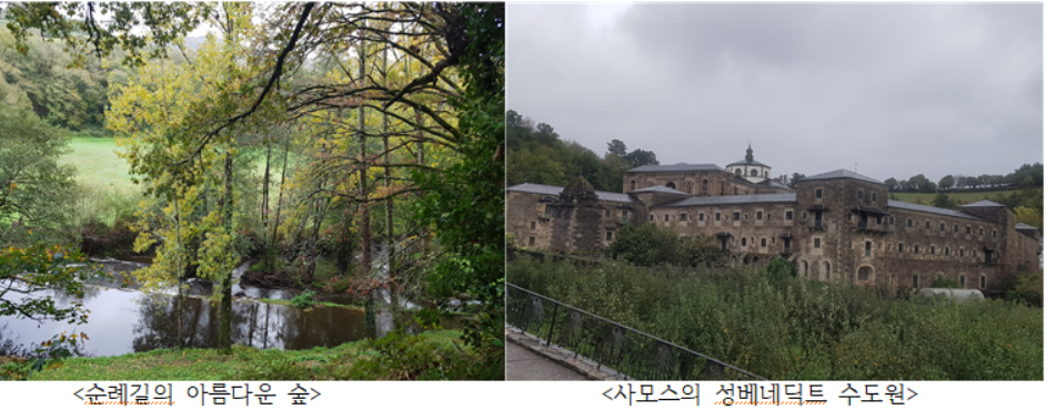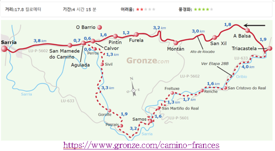 오늘(10. 23) 코스는 남쪽과 북쪽 2개 코스가 있는데 우리는 대부분의 순례자들이 가는 남쪽 코스를 선택했다. 트리아카스텔라(Triacastela)를 출발하여 ▷ 사리아(Sarria)까지 25km를 6시간 동안 걸음 수는 4만 7 천보였다. 북쪽 코스는 6km 가까운 반면 가팔라서 비교적 힘든 코스였다.