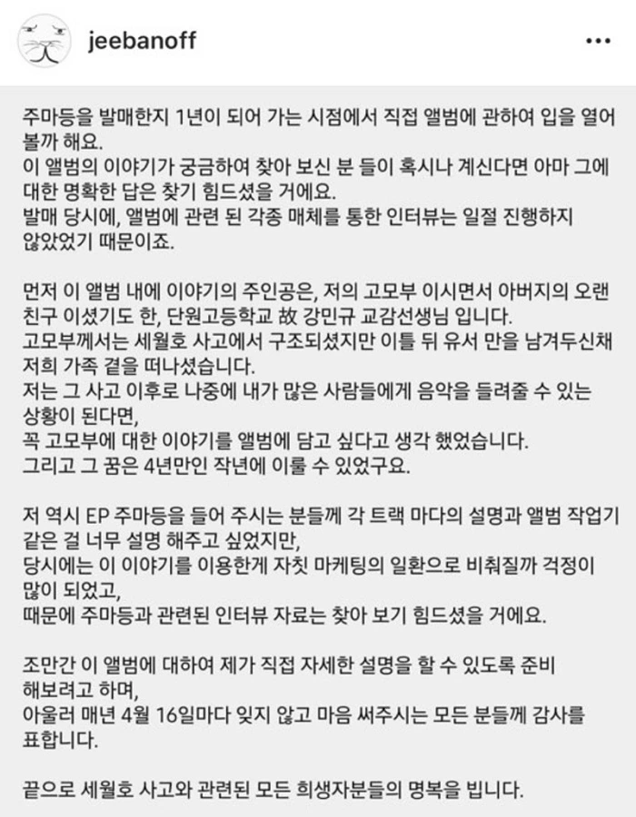 지난 4월 16일, 그의 인스타그램에 한 게시물이 올라왔다. 그리고 그는 앨범 발매 이후 1년이 다 되어 앨범 [주마등 : 走馬燈]속에 담긴 의미들에 대해 입을 열었다. 이렇듯 그는 앨범 [주마등 :走馬燈]을 통해 결코 가볍지 않은 진심이 담긴 이야기를 음악에 담아내며, 수많은 사람들에게 작지 않은 울림을 건네는 의미 있는 행보를 이어나갔다.