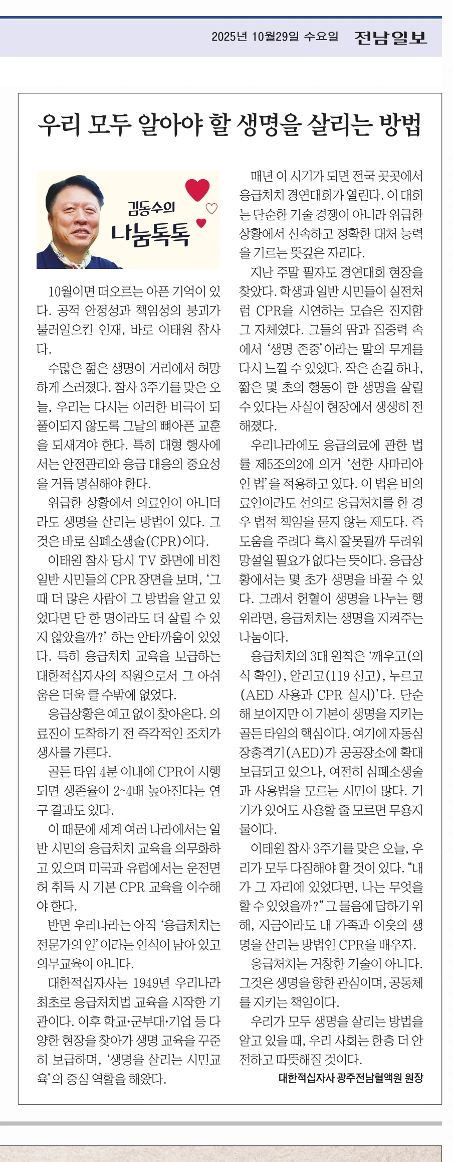 지난 주말 필자도 경연대회 현장을 찾았다. 학생과 일반 시민들이 실전처럼 CPR을 시연하는 모습은 진지함 그 자체였다. 그들의 땀과 집중력 속에서 ‘생명 존중’이라는 말의 무게를 다시 느낄 수 있었다. 작은 손길 하나, 짧은 몇 초의 행동이 한 생명을 살릴 수 있다는 사실이 현장에서 생생히 전해졌다.