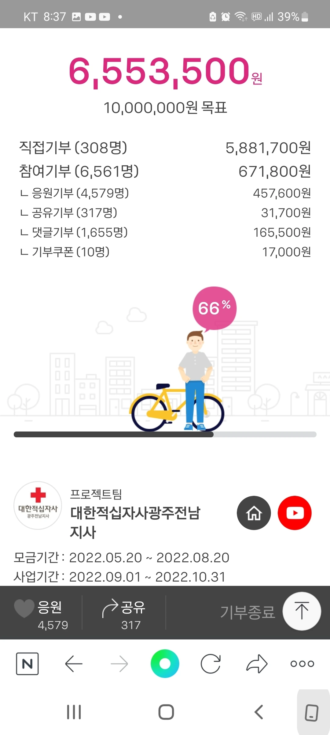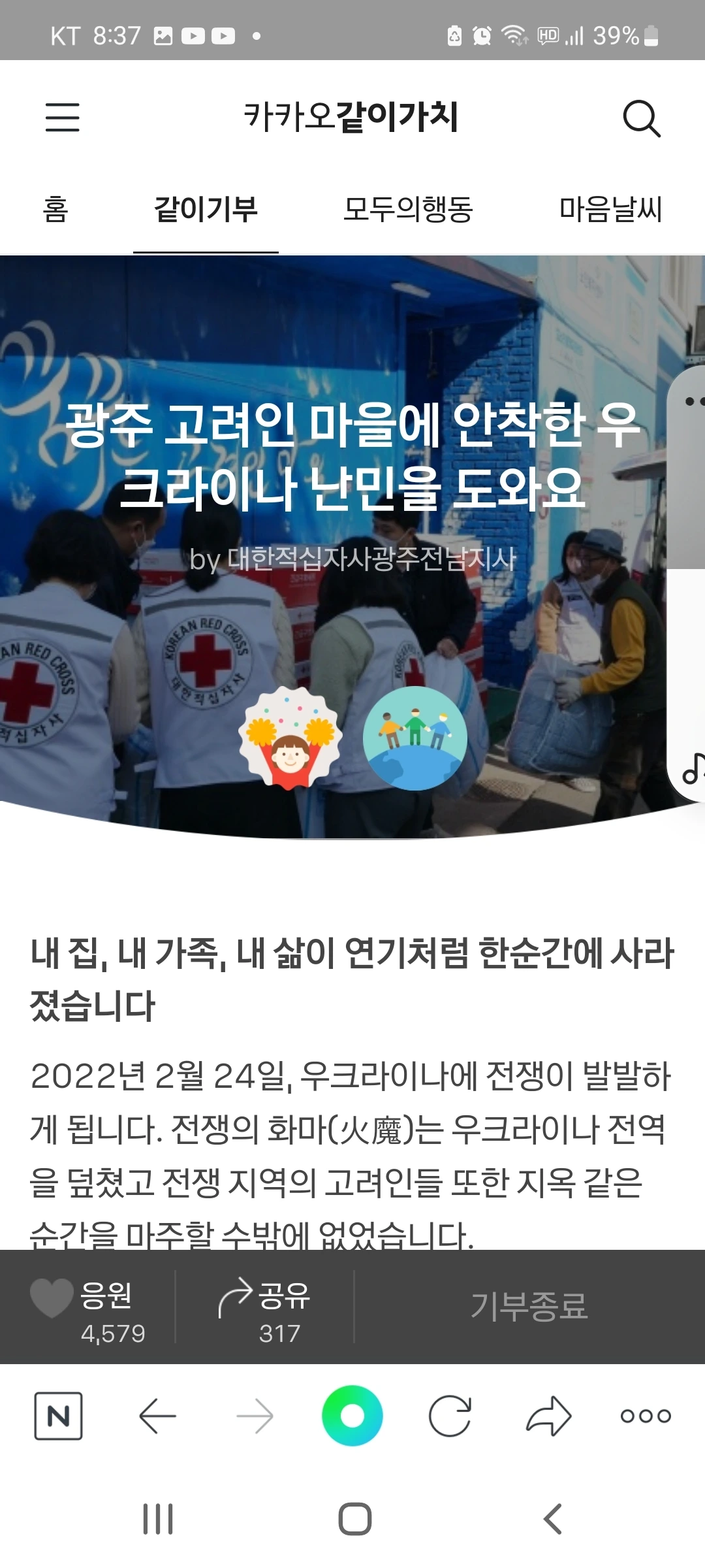 누군가를 돕는 내용을 보고 기부도 하는데, 공유, 응원과 댓글만 달아도 카카오에서 100원씩 지원을 해준다.