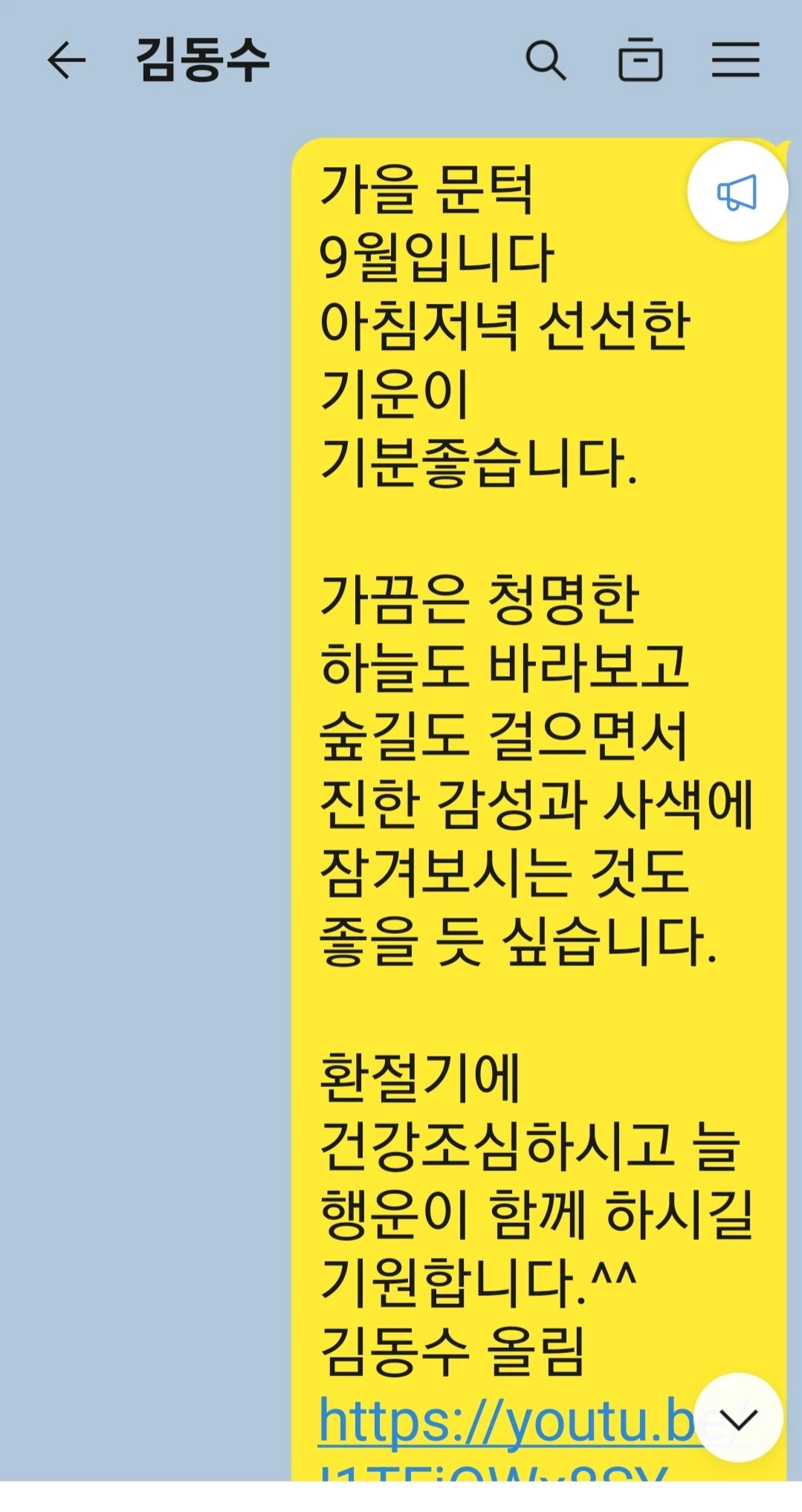 누군가를 잊지 않고 생각하면서 행운과 건강을 기원하는 안부 전하 기는 기분 좋은 일이다. 예를 들면 매월 계절인사를 한다. "가을 문턱 9월입니다. 아침저녁 선선한 기운이 기분좋습니다.~~~"